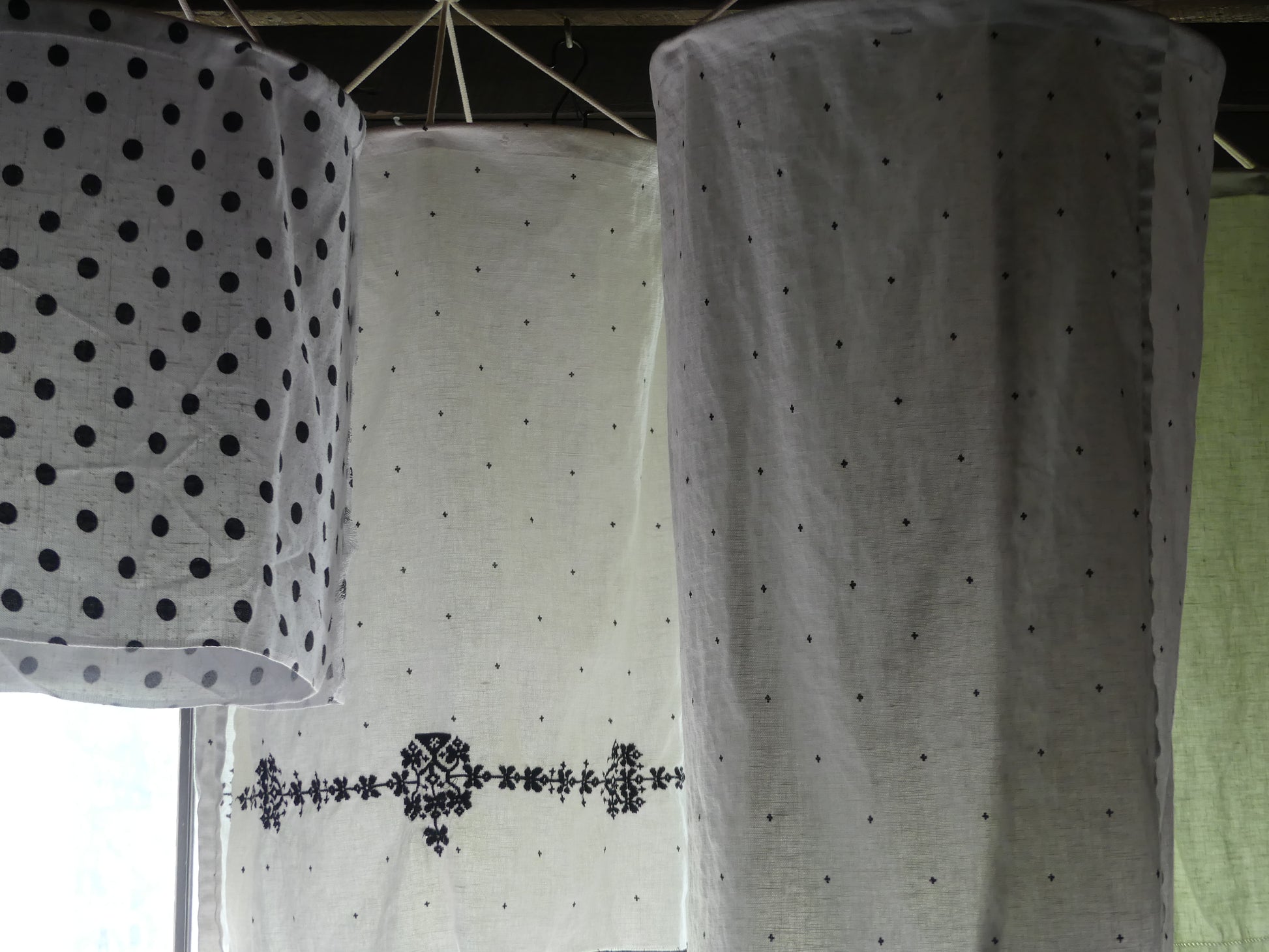 Handmade fabric lantern shade with embroidery detail, the simplest of designs to give maximum effect. A perfect balance of rustic charm and modern minimalism, bringing a soft, organic feel to your space while diffusing light gently for a warm, cozy ambiance adding a touch of understated elegance to any room. This versatile lantern makes a beautiful addition to any space, whether as a statement piece over a dining table, a cozy reading nook, or as a bedside pendant for a warm, textured aesthetic. Clustered in a grouping of three they add a dramatic effect to any dining room, entrance, or curved staircase. Each lantern will have a slightly organic shape due to the nature of the fabric. Handcrafted from repurposed linen and linen mixes so each is unique.